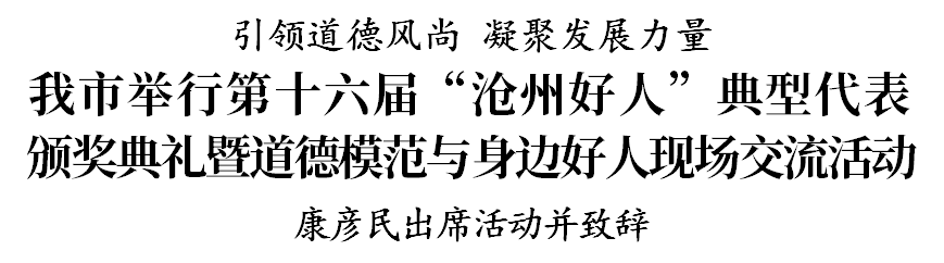 康彦民在致辞中代表市委、市政府和全市730万人民,向道德模范和“沧州好人”典型代表致以崇高敬意,向长期以来关心、支持、参与“好人之城”建设的社会各界和广大群众表示衷心感谢。康彦民说,当前,全市上下正深入学习贯彻党的二十大精神,全面落实党中央、国务院决策部署和省委、省政府工作要求,解放思想、奋发进取,奋力谱写中国式现代化沧州美好篇章。新时代新使命,更需要模范引领、精神带动、道德支撑。我们开展此次活动,就是要传递榜样力量,弘扬新时代雷锋精神。要巩固活动成果,总结好人经验,推动评选活动常态化、长效化,擦亮“好人之城”名片,切实把活动成果转化为优化营商环境、提升沧州美誉度影响力的重要载体;要突出正向引领,发挥舆论主流作用,广泛宣传先进事迹,传播真善美,传递正能量,营造尊崇好人、学习好人、争当好人的良好社会氛围;要加强全面关怀,在政策导向、荣誉奖励上强化支持激励,在个人成长、日常生活中倾力关心关爱,确保“德者有得”“好人好报”。同时,希望道德模范和“沧州好人”代表珍惜荣誉、再接再厉,发挥榜样示范引领作用,影响和带动更多身边人向上向善、向美向好,为加快建设现代化沿海经济强市贡献更大力量。